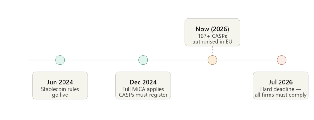 The July 1, 2026 deadline is the final cutoff. Any crypto firm that was operating under old national rules must either hold a full MiCA licence by that date, or stop offering services in the EU entirely.