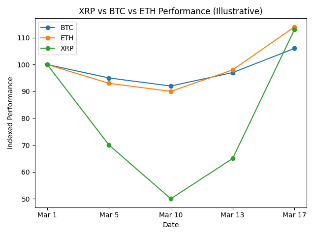 Figure 1 — XRP outperforming Bitcoin and Ethereum during the March recovery phase.